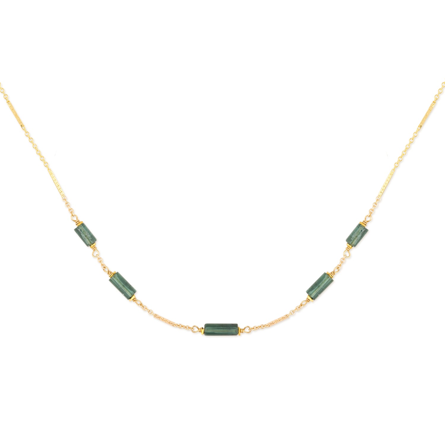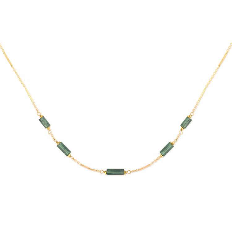 Delicate 14K gold bar and link chain necklace accented with gorgeous teal indicolite tourmaline stones. Works beautifully on its own or paired with other pieces. Length - 16"