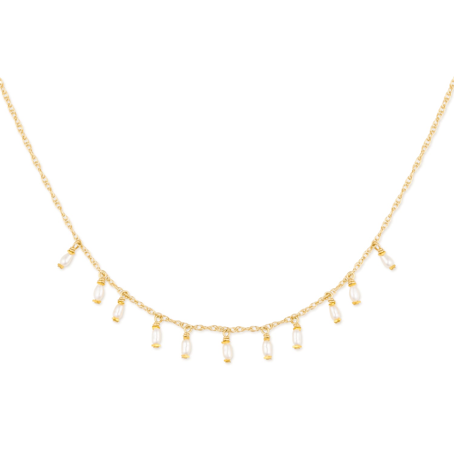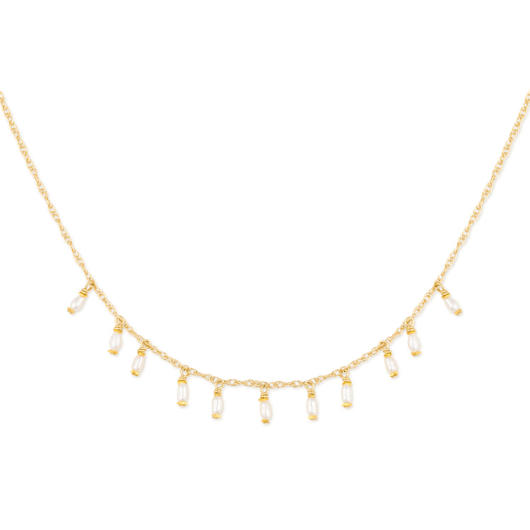 Elegant 14K gold necklace with petite freshwater pearl drops, perfect for layering or wearing alone. Length - 16"