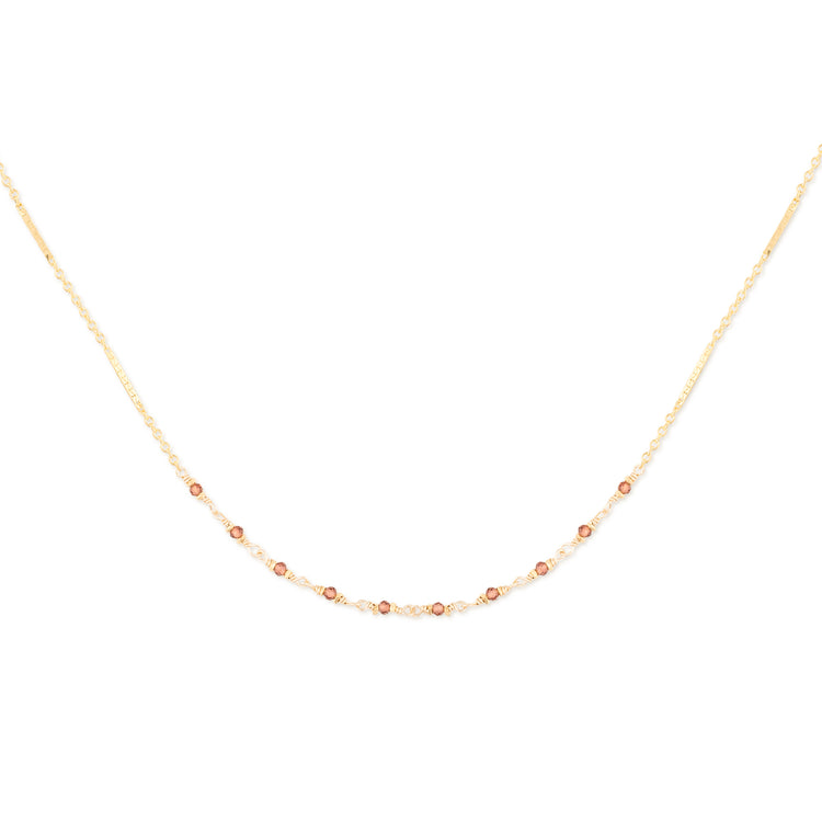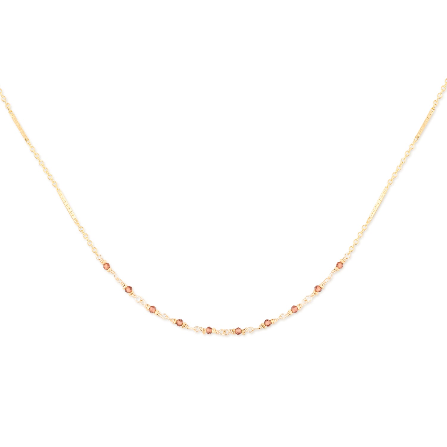 A classic 14K gold-fill bar and link chain necklace embellished with gorgeous, faceted garnet gemstones. Beautiful on its own or layered with other pieces from the collection