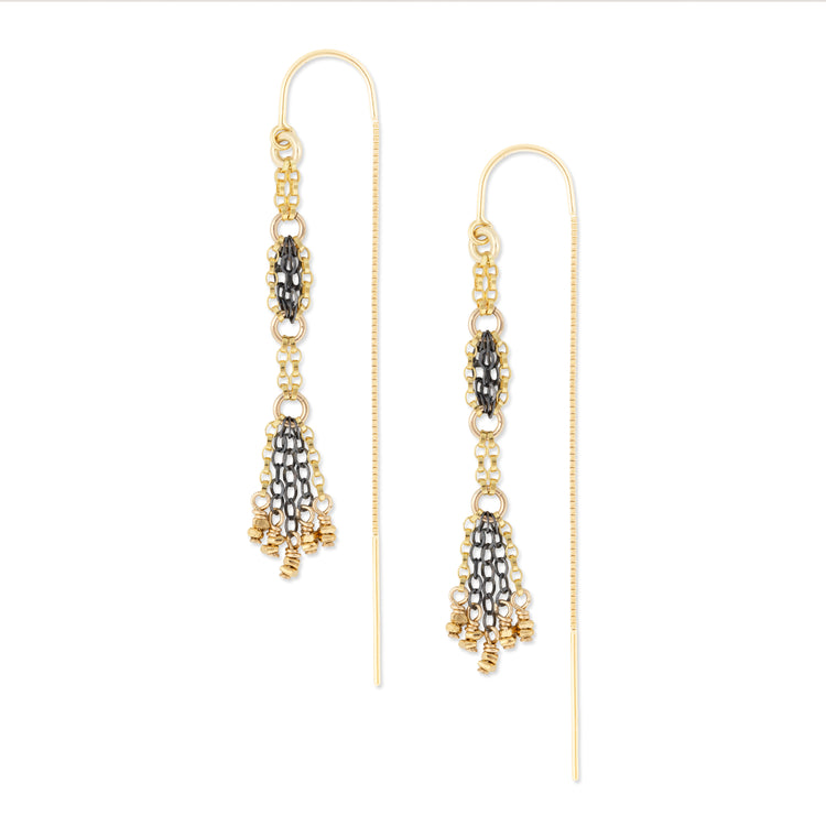 Refined threader earrings crafted from 14K gold-fill and oxidized sterling silver, accented with gold vermeil beads. Designed for everyday elegance. 2" in overall length