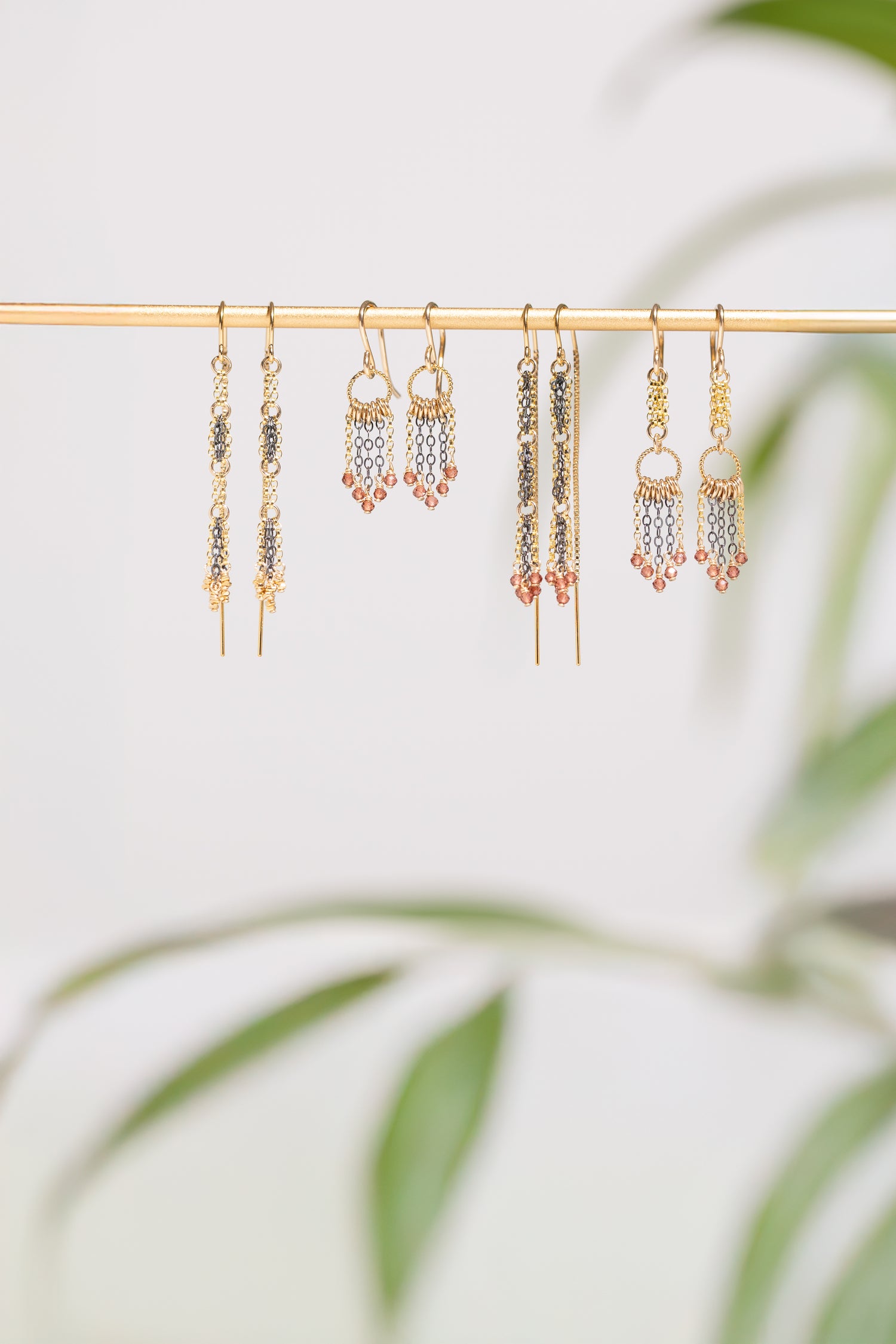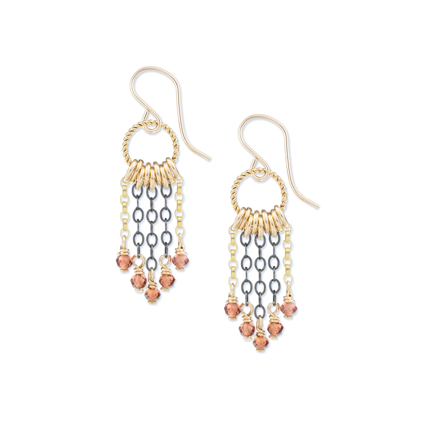 Elegant, lightweight 14K gold-filled braided circle fringe earrings, combining mixed 14K gold-fill and oxidized sterling silver accents, beautifully accented with natural faceted garnets. Measures approximately 1/2" in length.