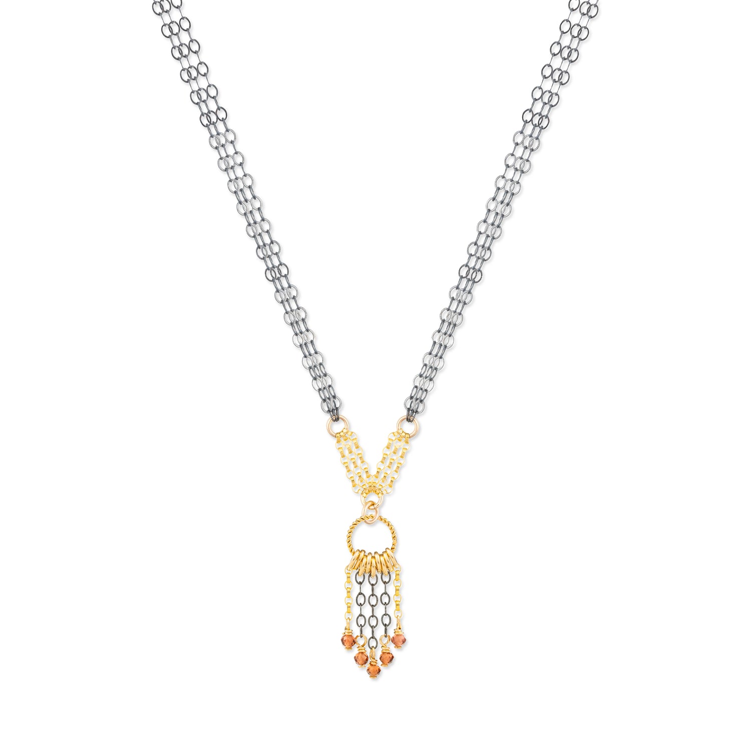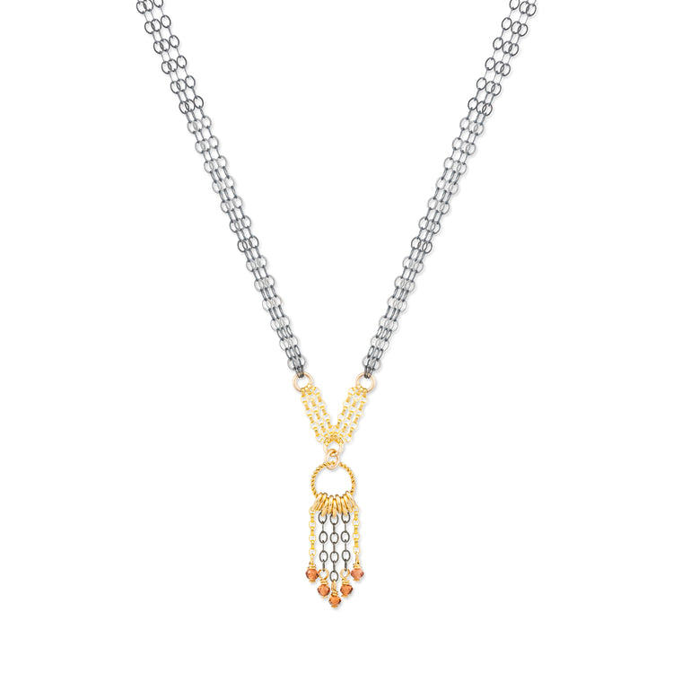 Triple-strand oxidized sterling silver necklace featuring a delicate fringe pendant crafted from mixed 14K gold and oxidized sterling silver, accented with natural faceted garnets. Measures 16" in length with a 2" extender for adjustable wear.