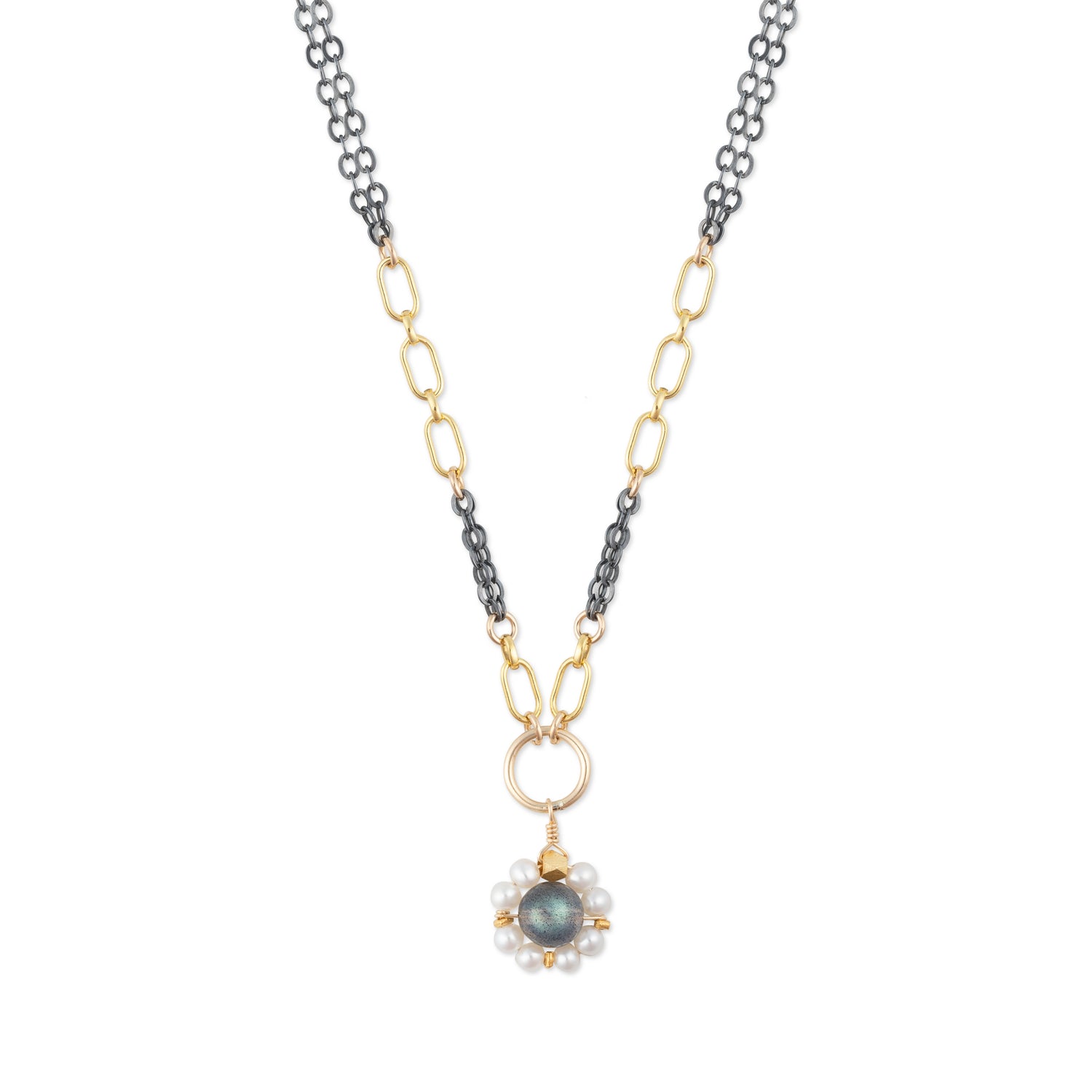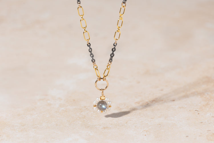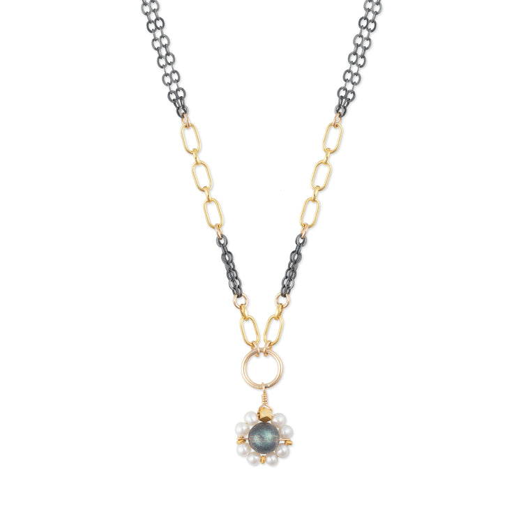 Luminous labradorite framed by high-quality round freshwater pearls and accented with a 14K gold-fill circle, suspended from delicate multi-strand chains in 14K gold-fill and oxidized sterling silver.