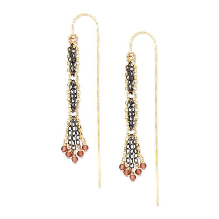 Refined 14K gold-filled and oxidized sterling silver threader earrings, featuring microfaceted natural garnets. At 2" in length, they're lightweight and modern, with an accent of gorgeous natural red color.