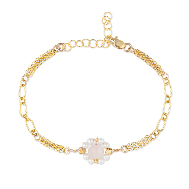 Delicate bracelet featuring rose quartz framed by round freshwater pearls on multi-strand 14K gold-fill chains. Lightweight and timeless, designed to layer beautifully or wear alone.